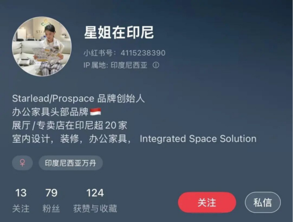 网财经《公司研究院》发现,小红书上一个名为“星姐在印尼”的账号,自称是Starlead/Prospace品牌创始人,频繁分享公司办公家具产品,账号主体疑似为何星。