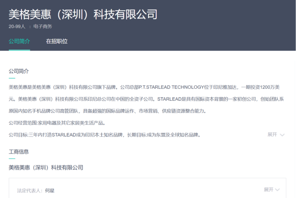 目前,Starlead已在国内设立分公司,即美格美惠(深圳)科技有限公司,企查查信息显示,何星为该公司第一大股东,持股比例达50%。