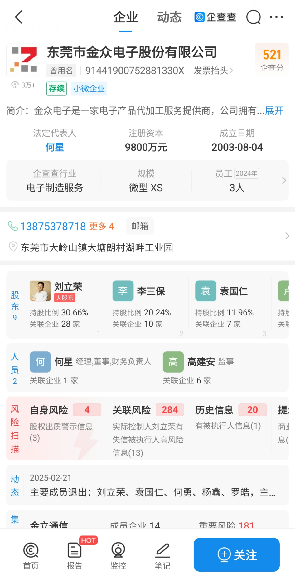 企查查信息显示,2025年2月,金立集团旗下的东莞市金众电子股份有限公司曾发生高管变更,何星出任该公司法定代表人、董事、财务负责人及经理;刘立荣虽退出高管行列,却仍以30.66%的持股比例,成为第一大股东。